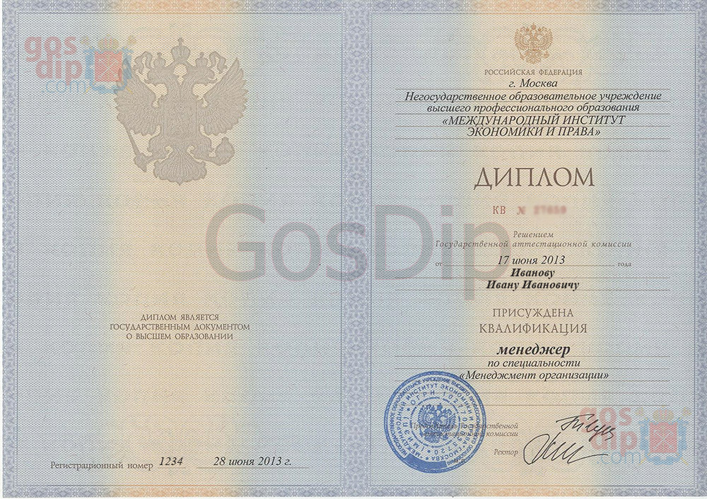 В верхней части правой стороны бланка диплома указывается город или населенный пункт, где находится вуз, и официальное название вуза (как в уставе) в именительном падеже. (Здесь: г. Москва, Междунарондный институт экономики и права)